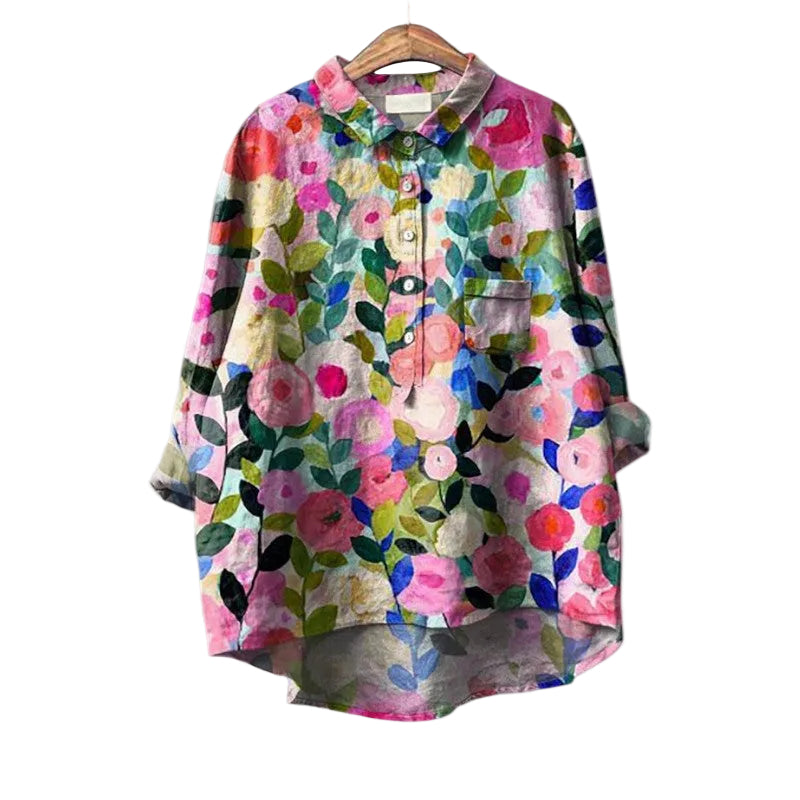 Opdag den perfekte bluse til enhver lejlighed! Let og åndbar, denne bluse giver et velplejet og raffineret udseende. Dens kunstneriske mønster i harmoniske nuancer skaber en effekt af “chic uden anstrengelse”, ideel til din hverdag.